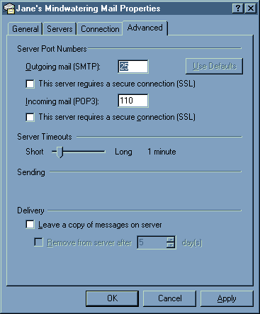 1. Server Port Numbers: Mindwatering uses the standard ports 25 and 110. These do not need to be changed.