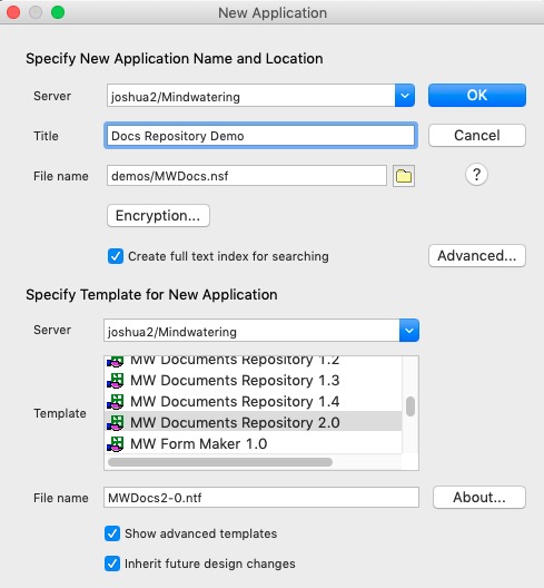 - Under Specify Template for New Application, Select the Server for the template location, and click the Show advanced templates check-box. Select the template, MW Documents Repository 2.0.