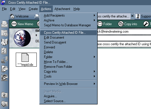 • The administrator chooses "Actions" on the Notes menubar and then chooses "Cross Certify Attached ID File..."