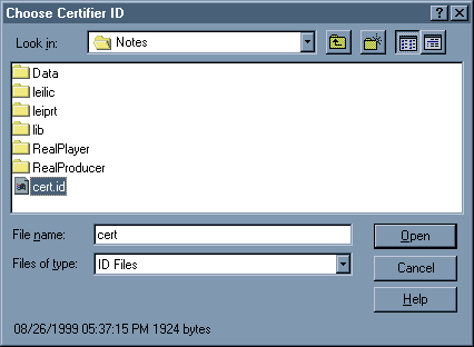 • In the file browsing dialog box, locate and select the certifier ID. Press the "Open" button.