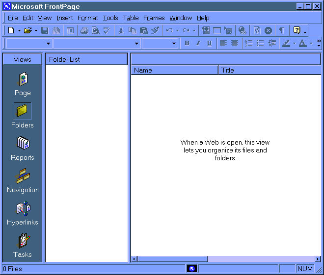 1. Open FrontPage2000 ("Start" button to "Programs" folder, Frontpage icon will be below the subfolders.) You will have a screen which looks like the one below: