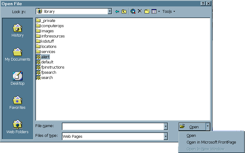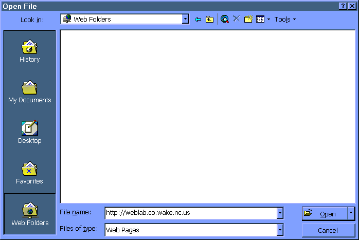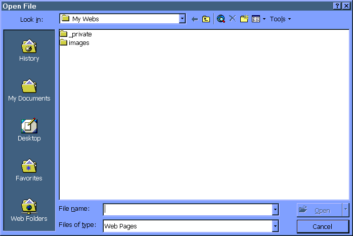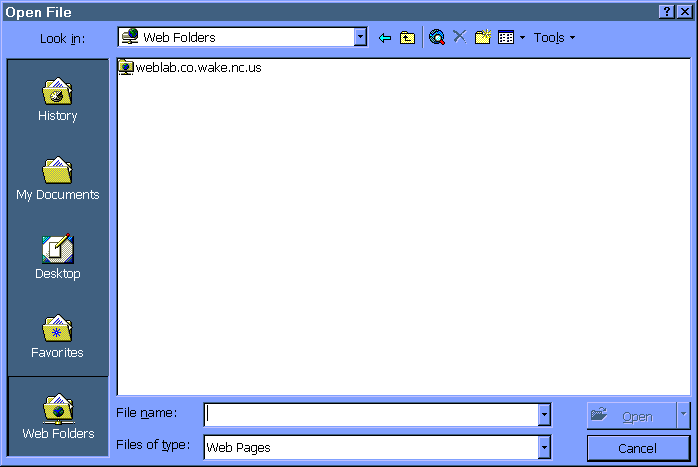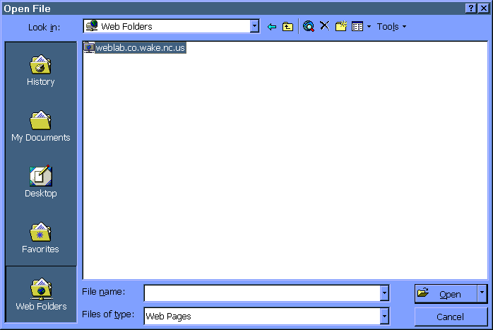 3. Whether you are in the "My Web" or the "Web Folders" category views, you may simple just enter the server name and directory to load your web site. In other words, you don't have to be in the right cateogory view to type in a web site for loading. With either view you have to type the web site into the "file name" field and press the "Open" button.