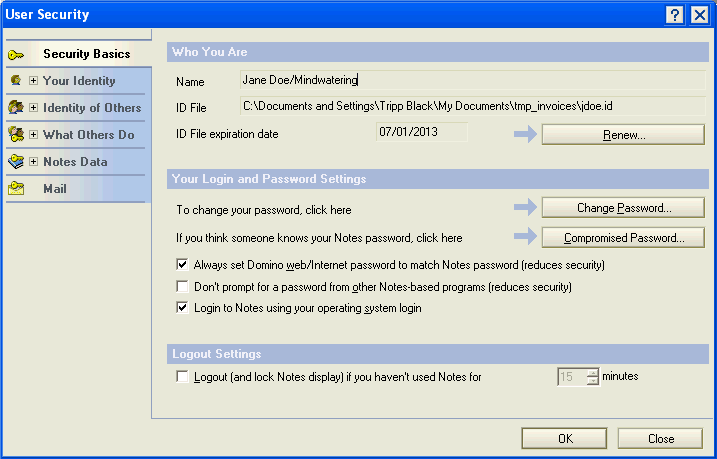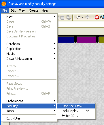 1. Select "File" on the menu across the top of the Notes window. Under File, click "Security", then "User Security...".